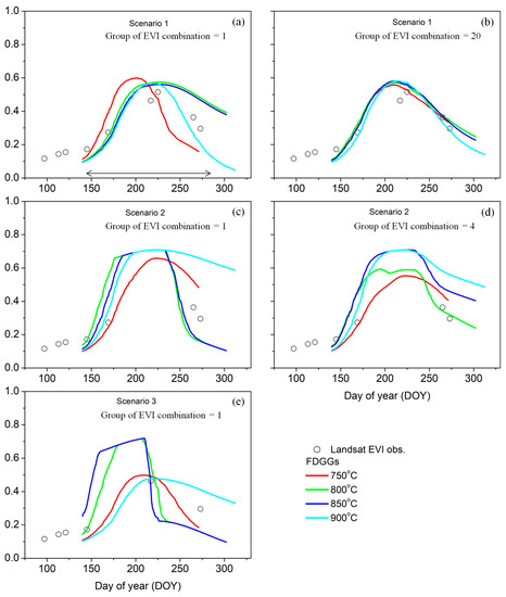 Landsat EVI observations from DOYini to the end of the crop growing seasons (around mid-October in Northeast Asia) were utilized to generate various combinations of EVI observations. An exhaustive sampling without replication method was employed to develop these groups of EVI observation combinations, resulting in m groups of EVI observation combinations, as shown in Figure 3. Each of these m groups was then input into LTDG_DL to produce an equal number of dEVILTDG_DL outputs. By averaging the m groups of dEVILTDG_DL, a single seasonal EVI profile was obtained (see in Figure 3). Notably, it was observed that EVI combination groups with a least three Landsat EVI observations performed better than those with only one or two observations. If there were fewer than three Landsat EVI observations available over the crop growing seasons, no EVI combination groups could be generated. Figure 2b illustrates the generation of twenty EVI combination groups using the exhaustive sampling method with six Landsat EVI observations (). Interestingly, the results showed no significant differences in reconstructed daily EVI data when comparing the FGDDs of 750, 800, 850, and 900 °C, which contrasts with the finding presented in Figure 2a. Furthermore, Figure 2d exhibits the superior performance of the FGDDs = 750 °C compared to Figure 2c when four groups of EVI combinations () were used to drive the LTDG_DL model. This is evidenced by the reconstructed maximum EVI closely aligning with the maximum EVI observation shown in Figure 2a. In Figure 2b,d,e, it is apparent that the FGDDs of 750 °C yielded the best results in reconstructing daily EVI data. These findings suggest that the exhaustive sampling without replication method improved the accuracy of EVI reconstruction in crop pixels with low Landsat EVI observation density.