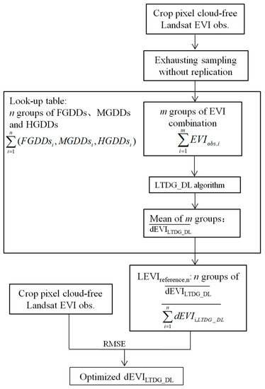 Data-processing roadmap of the FGDD-constrained optimization solution involved in the LTDG_DL algorithm. obs.: observation; GDDs: Growing Degree Days; EVI: Enhanced Vegetation Index; RMSE: root mean square error; LTDG_DL: a parameter-constrained Light- and Temperature-Driven Growth (LTDG) model and Double-Logistic (DL) function fusion algorithm; FGDDs: the accumulated GDDs required to complete the vegetative growth and Flowering stage; MGDDs: the accumulated GDDs for completion of the Maturation stage; HGDDs: the accumulated GDDs for completion of the Harvest stage; : the mean of daily EVI data reconstructed by m groups of EVI observation combinations.
