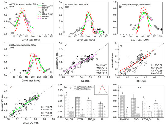 Evaluations of the EVI reconstruction accuracy of the DL, LTDG, and LTDG_DL methods in experimental fields in Yanhu, China (a), Nebraska in the USA (b,d), and Gimje in the Republic of Korea (c). The S1 manipulation scenario (small triangles) represented the condition of artificially masked EVI observations during the rapid green-up and senescing periods; the S2 manipulation scenario (big circles) represented the case with missing EVI observations around the date of the maximum EVI. All growing season Landsat EVI observations were applied to evaluate algorithm accuracy (e,f,g). Different letters in (h,i) indicate that, at the 0.05 level, the difference of the population means was significantly different with the null hypothesis (mean1 − mean2 = 0, one-way ANOVA). The 95% error bars were added to the LTDG_DL S1 and S2 simulations. The inset in (h) shows the calculation modes of the EVI increment and decline slopes. EVI: Enhanced Vegetation Index; obs.: observation; pred.: prediction; LTDG: the Light- and Temperature-Driven Growth model; DL: the Double-Logistic function; LTDG_DL: the LTDG and DL fusion algorithm.