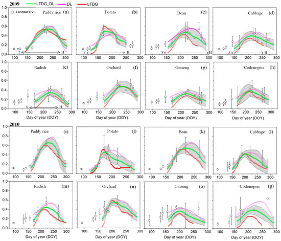 Reconstruction of daily Landsat EVI data using the LTDG, DL, and LTDG_DL methods in paddy rice (a,i), potato (b,j), bean (c,k), cabbage (d,l), radish (e,m), orchard (f,n), ginseng (g,o), and codonopsis (h,p) in the Haean basin. EVI: Enhanced Vegetation Index; T: date of seedling Transplanting; S: Seedling emergence date; H: Harvest date; LTDG: the Light- and Temperature-Driven Growth model; DL: the Double-Logistic function; LTDG_DL: the LTDG and DL fusion algorithm. The 95% error bars indicted by grey areas were added to the LTDG_DL simulations.