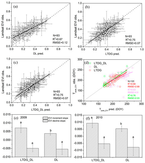 The comparisons of Landsat EVI observations and simulations revealed that the RMSE values for DL, LTDG, and LTDG_DL were 0.12, 0.07, and 0.07, respectively (Figure 7a–c). The corresponding R2 values were 0.67, 0.75, and 0.75, respectively. In the Tpeak_EVI estimation, the RMSE and R2 values were 4.9 d and 0.53 for DL, 2.68 d and 0.68 for LTDG, and 2.03 d and 0.76 for LTDG_DL (Figure 7d). In 2009, the average EVI increment slope across eight crop types in the LTDG_DL simulations was approximately 0.007, which was 85% higher than that of the DL simulations (Figure 7e), consistent with the findings shown in Figure 5h,i. There were no significant differences in the EVI decline slope between the two methods. Similarly, in 2010, the LTDG_DL yielded an EVI increment slope that was 72% higher than that of the DL method (Figure 7f).