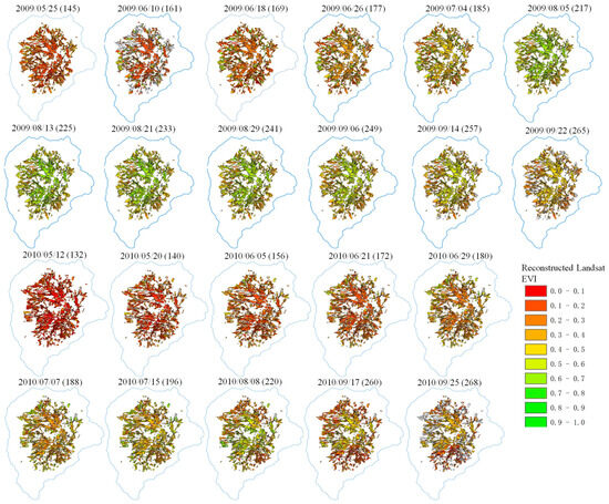 Figure 8 displays the reconstructed EVI images on the Landsat EVI observation dates in the Haean basin by LTDG_DL. During the period from 145 to 169 DOY in 2009 and 2010, most agricultural lands were dry, while some fields were flooded and prepared for rice seedling transplantation. Seeding emergence did not occur before 160 DOY, causing most agricultural pixels on 132, 140/145, and 156/161 DOY in 2009 and 2010 to appear red (indicating low EVI). On 161 and 169 DOY in 2009, light green pixels were noticeable at the western part of the Haean valley, which are cultivated lands for potato. Potato pixels became deep green on 185 DOY and returned to light green again on 225 DOY, matching the potato field phenology [3]. Orange dominated the paddy pixels on 177 DOY, then shifted to light yellow on 185 DOY and, finally, turned green on 225 DOY. On 257 DOY, light green and yellow colors indicated senescing canopies. Green colors were observed in upland fields around 217 DOY, which corresponded to the date of maximum canopy growth potential. The LTDG_DL well preserved the spatial details in the EVI time series of various crops in 2010.
