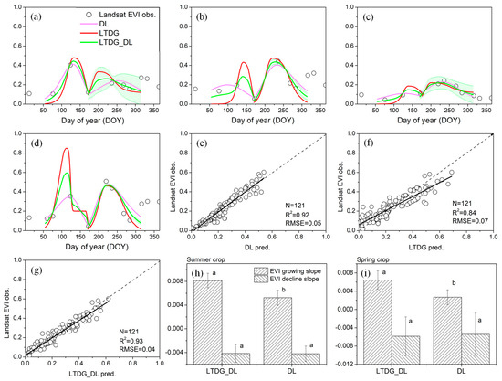 Comparisons in the reconstruction accuracy of daily Landsat EVI data among the DL, LTDG, and LTDG_DL methods in randomly selected crop pixels (a–d) in Shandong Province. Comparisons in EVI observation and predictions by the three methods are presented in plots (e–g). Different letters in (h,i) indicate that, at the 0.05 level, the difference of the population means was significantly different with the null hypothesis (mean1 − mean2 = 0, one-way ANOVA). The dashed line was the 1:1 line (e–g) and the solid lines were the linear regression fits. LTDG: the Light- and Temperature-Driven Growth model; DL: Double-Logistic function; LTDG_DL: the LTDG and DL fusion algorithm; pred.: prediction; obs.: observation; EVI: Enhanced Vegetative Index.
