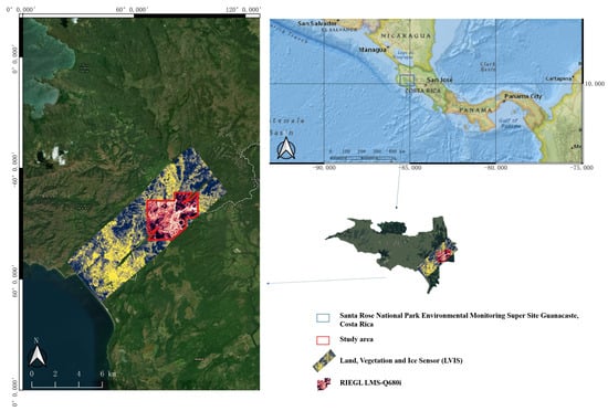 Location of the Santa Rosa National Park Environmental Monitoring Super Site in Guanacaste, Costa Rica, and the footprint of the LVIS data and the RIEGL LMS-Q680i data used in this study. The color ramp in LVIS, ranging from blue to yellow, represents the elevation changes from low to high. In the RIEGL LMS-Q680i system, a color gradient from dark red to white signifies a similar shift in elevation, with low elevations represented by lighter colors and higher elevations by darker shades. Base map source: ESRI Satellite, http://server.arcgisonlie.com/ArcGIS/rest/services/World_Imagery (accessed on September 3 2023) and ESRI National Geographic, http://services.arcgisonline.com/ArcGIS/rest/services/NatGEO_World_Map (accessed on 1 September 2023).