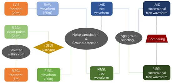 In this study, two different types of LiDAR systems were used for the analysis, as indicated above. The workflow used in this study is illustrated in Figure 2. The workflow aims to (1) upscale the small footprints from RIEGL (1 m) to LVIS (20 m), (2) produce the RIEGL waveform and unify its format with the LVIS data, (3) produce the tree waveforms, (4) separate three successional stages, and (5) conduct a comparison using waveform metrics between 2005 and 2021.