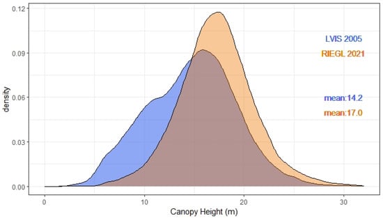 According to Roberts [], canopy structure (e.g., density and closure) influences the recognition of the highest point of the canopy instead of the highest peak of the largest mode in a waveform. Therefore, to select the ground peak, Harding et al. [] specified that the ground surface must be the end-peak of the relative amplitude. They also found that the beginning of the first main peak was at the top of the canopy and the strongest return from the bottom was the ground return. Therefore, it is hypothesized that the RIEGL average tree height () in 2021 is greater than the LVIS average tree height in 2005.