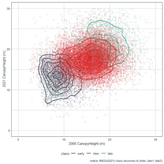 Figure 13 presents a comparison for RG between 2005 and 2021. The 2021 density line demonstrates an upward trend as trees are growing, which is expected from an ecological point of view. Figure 13 presents the distribution of RG as a function of successional stage. The tree growth depicted in Figure 14 appears to follow the successional stage group, with the late stage having the highest rate of rise and the highest RG value compared with the early stage in 2005, as indicated by the bottom of the point cloud.