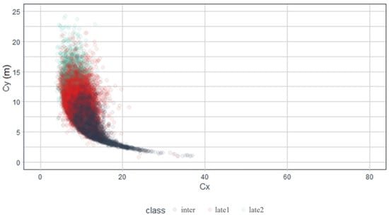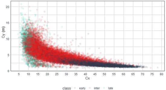 In Figure 10, which pertains to the year 2021, the primary Cx values exceed 20, indicating a significant decrease compared with the Cx values in 2005, which is related to the high ground return in leaf-off season. Additionally, the stages are more distinctly separated, with pronounced margins observed between them. The demarcation between the intermediate stage and late1 stages becomes apparent when Cy attains a value of 7, while the distinction between the late1 and late2 stages becomes apparent at a Cy value of 15. Despite some overlap between the late1 and late2 stages, most of the data points are concentrated in the late1 stage.