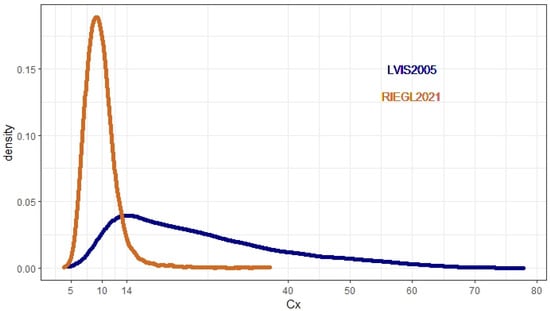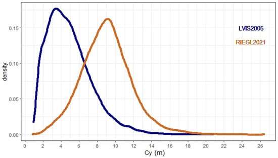 In Figure 11, the LVIS (2005) frequency distribution presents a plateau in point density at Cx = 14 and continually decreases the density to Cx = 78. The highest Cx point density in 2021 is reached at a Cx of 9 waveform amplitude. Simultaneously, the max Cx in 2021 reached 37, which is less than half of the maximum value recorded in 2005, which was approximately 78. The 2005 waveform surpasses the 2021 data, suggesting that the ground return energy in 2005 was greater than that collected in 2021. The primary factor driving this difference is that the leaf-off season’s Cx is typically higher than in the leaf-on season. Consequently, less canopy cover is available to absorb the energy during the leaf-off season.