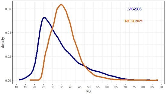 Line graph illustrating the density of the RG distribution in 2005 and 2021.