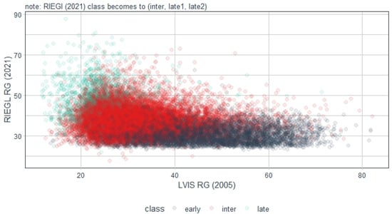 Point graph showing the RG points grouped by the early, intermediate, and late stages. The X axis represents the LVIS 2005 data, and the Y axis is RIEGL 2021 data. The colors black, red, and blue represent the early stage, intermediate stage, and late stage, respectively.