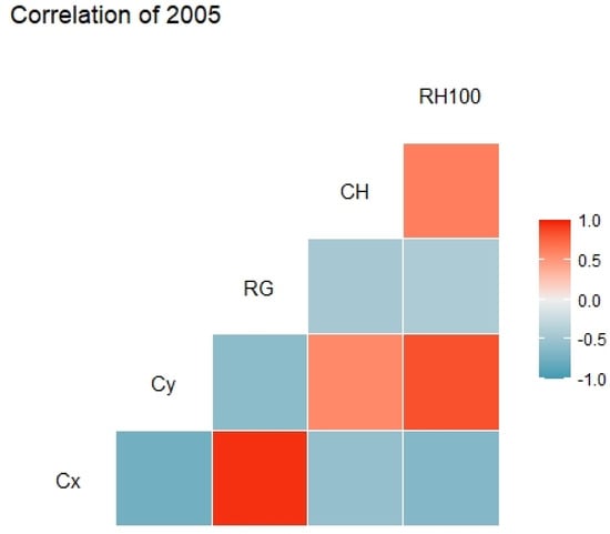Correlation graph showing the relation between the Cx, Cy, RG, CH, and RH100 metrics in 2005. The color gradient represents the degree of positivity or negativity between the measurements. Blue is negative, whereas red is positive.
