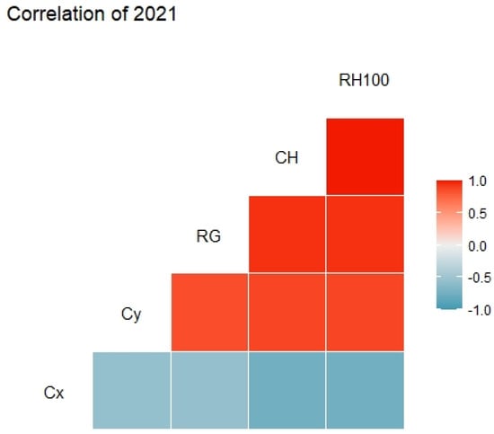 Correlation graph showing the relation between the Cx, Cy, RG, CH, and RH100 metrics in 2021. The color gradient represents the degree of positivity or negativity between the measurements. Blue is negative, whereas red is positive.