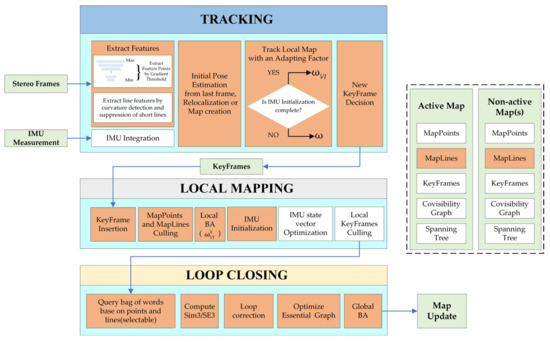 Our method mainly improves on the ORB-SLAM3 and also implements three different threads: tracking, local mapping, and loop closing. We incorporate line features into each module of ORB-SLAM3.