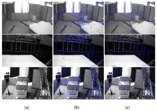In addition, although EDlines can run without tuning parameters, when line features are applied in SLAM, we need more long line segments that can be tracked stably. Short line segments may be obscured in the next frame, making matching difficult, and the processing of a large number of useless short segments increases the computation time. Therefore, we add a filtering criterion to the original EDlines method of selecting the minimum line segment length based on different pixels, i.e., determining the length based on the number of feature points. The core idea is that, when the number of feature points is larger than the threshold