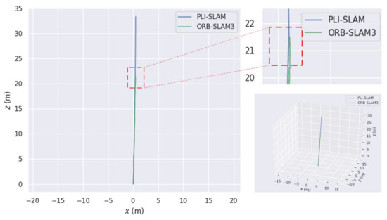 Figure 9, from the trajectory results of the two algorithms, PLI-SLAM has good robustness to low texture, while ORB-SLAM3 leads to a large error of visual-IMU alignment because of few point features extracted, which in turn leads to tracking fails.