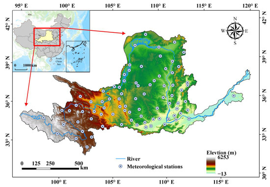 Yellow River Basin (hereinafter abbreviated as YRB) located in Central Northern China, covers a significant geographical area spanning latitudinal range of 32–42°N and longitudinal range of 96–119°E, at elevations between −13 and 6253 m (Figure 1). Yellow River starts from the Bayankala Mountain foothills of Tibetan Plateau, and flows for 5464 km, before eventually discharging into the Bohai Sea, passing through nine provinces. YRB experiences a continental climate with arid, semi-arid, and semi–humid climatic changes. The temperature fluctuation throughout the year is significant, and the multi–year average precipitation stands at approximately 451.7 mm [32]. Grassland area covers the largest portion of the YRB, mainly found in the north of the middle streams, and the upper streams of the YRB. Forests and cultivated land are the second largest land cover classes, primarily distributed in the southeast of the mid–streams and down–streams [33].