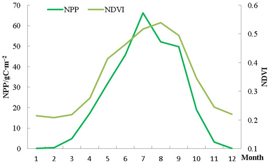 Multi–year monthly averaged values of NPP and NDVI over the YRB.