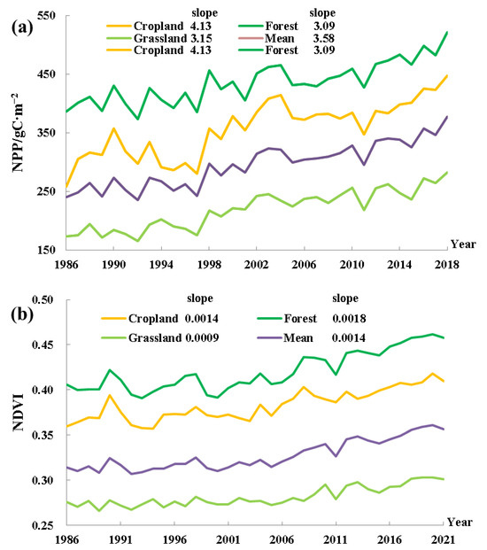 Annual (a) NPP and (b) NDVI of cropland, forest, and grassland over the Yellow River Basin.