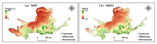Spatial distributions of multi–year averaged value of (a) NPP and (b) NDVI in YRB (the datum and the EPSG of the map–WGS_1984, EPSG:4326).