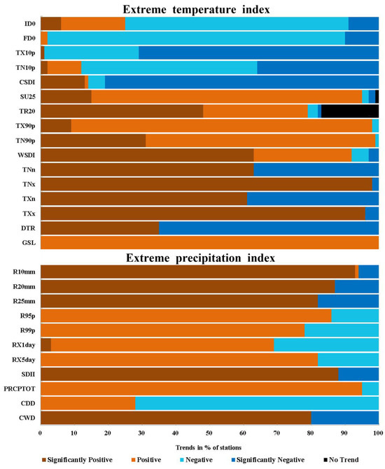 Percentage of meteorological sites with both noticeably negative and noticeably positive tendency of extreme climate indexes in the YRB. A significance level (α = 0.05) was chosen to judge the presence of a tendency.