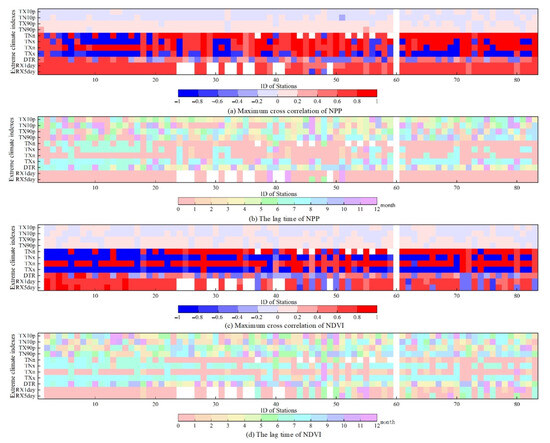 Time–lag cross–correlation of between NPP, NDVI, and extreme climate indexes at meteorological stations in the Yellow River Basin.