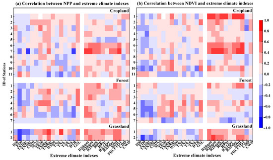 Relationship between NPP, NDVI, and climate extreme indexes at meteorological sites in the ecosystems of cropland, forest, and grassland, respectively.
