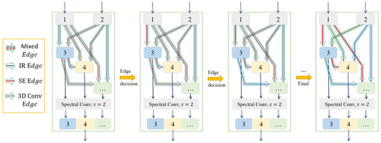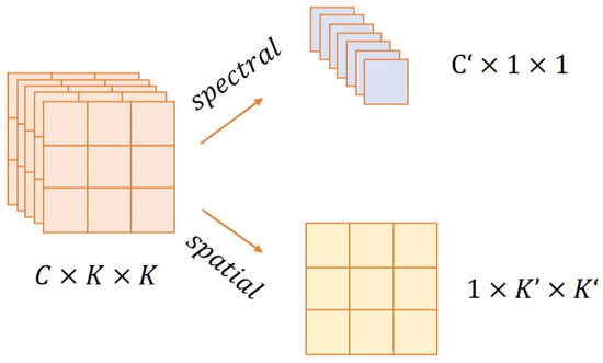 - 3D decomposition convolution. In this paper, 3D convolution is decomposed into two types of decomposition convolution for processing spectral and spatial information, respectively. The principle of 3D decomposition convolution is shown in Figure 3, where a 3D convolution with a kernel size of is decomposed into two decomposition convolutions with a kernel size of and , respectively. This simplifies the complexity of a single candidate operation and allows the search space to yield more possibilities of models, which can significantly reduce the model parameters.