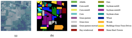 Indian Pines (IN) was collected by AVIRIS sensors in northwest India in 1992. This scene has 220 data channels, the spectral range is 0.2 to 2.4 m, and the size of each spectral dimension is 145 × 145. The image has a spatial resolution of 20 m/pixel and contains 16 feature categories, in which two-thirds are agriculture and one-third is forests or other natural perennial plants. Figure 6 shows the three-band false color composite of IN images and the corresponding ground truth data, respectively.