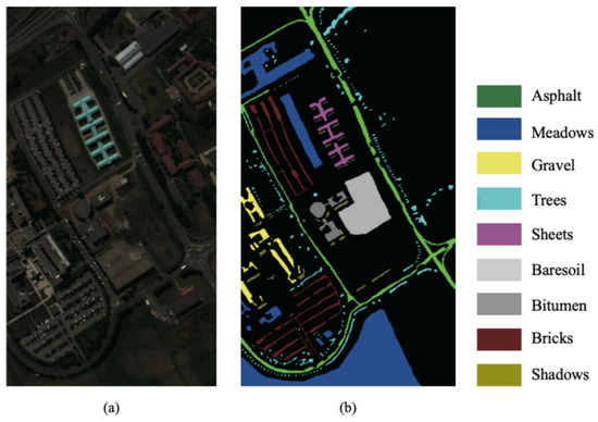 The ROSIS-03 sensor recorded the Pavia University (UP) image of the University of Pavia over Pavia in northern Italy. The image captures the urban area around the University of Pavia. The image size is 610 × 340 × 115, the spatial resolution is 1.3 m/pixel, and the spectral coverage is 0.43 to 0.86 m. The image contains nine categories. Before the experiment, 12 frequency bands and some samples containing no information were removed. Figure 7 shows the three-band false-color composite of the UP image and the corresponding ground truth data.