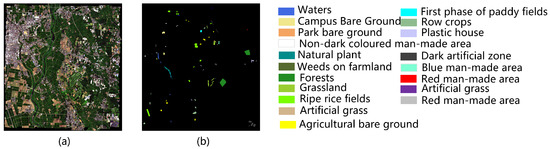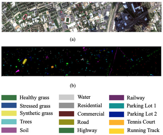 The Houston (HU) data set was collected by the Compact Aerial Spectral Imager (CASI) in 2013 on the University of Houston campus and adjacent urban areas. HU has 144 spectral channels, the wavelength range is 0.38 to 1.05 m, and the space size of 1905 × 349 is 2.5 m/pixel. It has 15 different ground truth classes with 15,029 marked pixels. Figure 8 shows the three-band false-color composite of the HU image and the corresponding ground truth data.