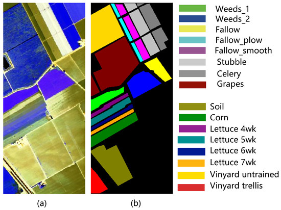 Salinas (SA) is captured by the 224-band AVIRIS sensor over the Salinas Valley in California and features high spatial resolution (3.7m pixels). The coverage area includes 512 rows by 217 samples. Like Indian Pines, 20 water absorption bands were discarded, leaving 224 bands remaining. The image contains 16 categories. Figure 9 shows the three-band false-color composite of the SA image and the corresponding ground truth data.