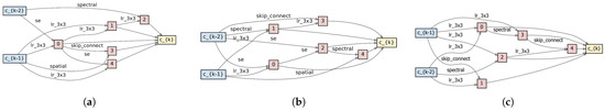 where is the set of candidate operations (i.e., , , …, ), o is a specific operation to be applied to , and parameterized by architecture parameters . Each intermediate node is computed by the following formula: