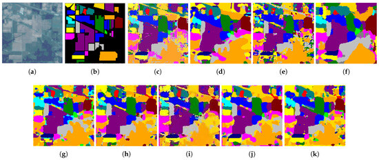 Classification maps for IN. (a) False-color image; (b) ground-truth map; (c) SVMCK; (d) 2D-CNN; (e) 3D-CNN; (f) DFFN; (g) SSRN; (h) DcCapsGAN; (i) AUTO-CNN; (j) LAMFN; (k) EL-NAS.