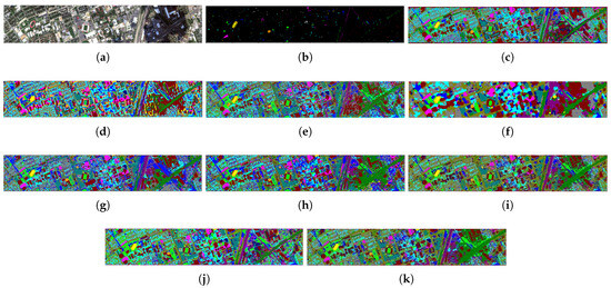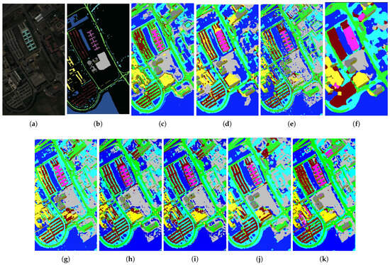 Classification maps for UP. (a) False-color image; (b) ground-truth map; (c) SVMCK; (d) 2D-CNN; (e) 3D-CNN; (f) DFFN; (g) SSRN; (h) DcCapsGAN; (i) AUTO-CNN; (j) LMAFN; (k) EL-NAS.