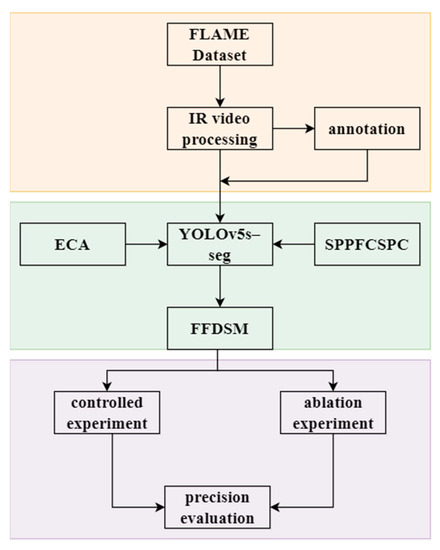 However, the aforementioned forest fire detection methods are based on optical images. Although detection methods based on such images are widely used, they have limitations in fog and low-light conditions and are prone to obstruction. Therefore, in this study, UAV infrared images are adopted to detect the obstructed forest fire. A Forest Fire Detection and Segmentation Model (FFDSM) is proposed based on the YOLOv5s-seg model. The FFDSM model incorporates the Efficient Channel Attention (ECA) [30] module and the Spatial Pyramid Pooling Fast Cross-Stage Partial Channel (SPPFCSPC) [31] module, enhancing the accuracy of fire detection and the capability to extract forest fire features. This model addresses the issue of the poor adaptability of traditional methods.