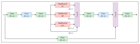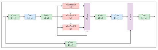 The SPPFCSPC incorporates the concept of improving and upgrading the SPP module to the SPPF module in YOLOv5 and makes further improvements to the SPPCSPC module, resulting in improved speed while keeping the receptive field unchanged. The three different maximum poolings in SPPCSPC have been changed to the same maximum pooling. Next, the three maximum poolings are sequentially connected. The structure of the SPPFCSPC is illustrated in Figure 6.