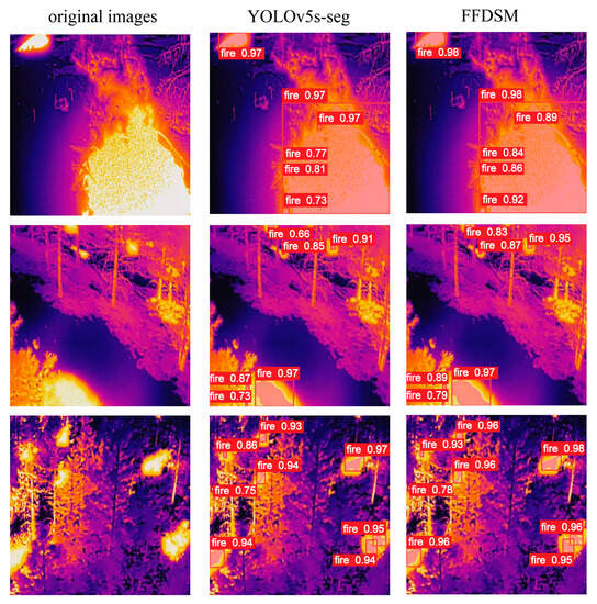 Furthermore, the FFDSM achieves significant improvements compared to YOLOv5s-seg. In the case of a mixture of large and small fires, the most significant improvement is observed in P, with an increase of 2.1%. In the case of large fires, the most significant improvements are seen in R and mAP@0.5, with increases of 2.6% and 2.0%, respectively. In the scenario with small fires, the most significant improvement is observed in mAP@0.5:0.95, with an increase of 5.3%.