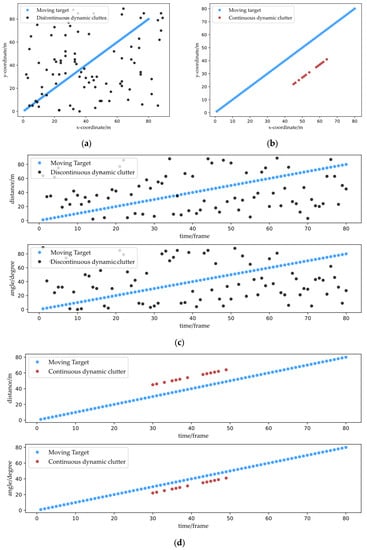 Figure 1. Simulation diagrams of dynamic clutters and the moving target, where black points represent non-continuous dynamic clutters, red points represent continuous dynamic clutters, and blue points represent observations of a moving target. (a) Spatial distribution of non-continuous dynamic clutter. (b) Spatial–temporal distribution of non-continuous dynamic clutter. (c) Spatial distribution of continuous dynamic clutter. (d) Spatial–temporal distribution of continuous dynamic clutter caused by radar indoor multipath scattering. - Continuous dynamic clutter, caused by radar indoor multipath scattering (abbreviated as “CDC” in the following) with non-zero velocity, are points generated from a moving target by multipath wave. A moving target usually generates at most one CDC point in a frame, which may be because the power of the multipath wave is significantly lower than that of the direct wave power, so it is difficult to observe higher-order multipath scattering detected through the constant false-alarm rate (CFAR) detection of the radar. Although the CDC sequence shows a shorter duration and is sparser than the moving target sequence, it nevertheless displays continuity and similarity to the trajectory detected by the direct wave from the same moving target. Figure 1c,d show the simulation diagrams of the spatial–temporal distribution of the CDC and the moving target observations, respectively.
