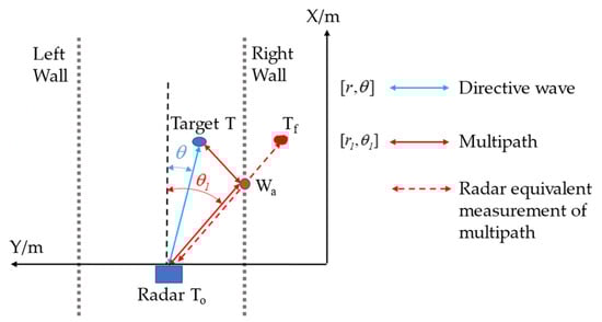 In order to find the characteristics that make the CDC sequence distinctive from the direct wave observation sequence of the moving target, it is necessary to analyze the CDC sequence in terms of its primary cause, the multipath effect. Figure 2 is a schematic diagram of the multipath effect wherein a MMV radar is detecting a moving target, where the solid blue line is the direct wave from the radar to the moving target, , the solid red line is the multipath from the radar coordinate system, , passing through the reflection point of the wall, , reaching the moving target, , and then returning to the radar. The detection through the solid red line is equivalent to the dashed red line, and then generates the measurement points, .