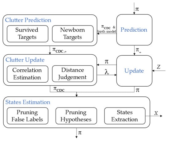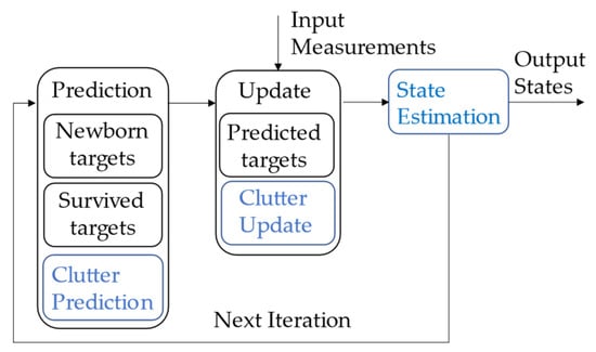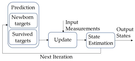 The scheme of the LMB filter is shown in Figure 3, which includes three main stages: prediction, update, and state estimation. The LMB filter approximates the Bayes multi-target filter, which approximates predicted and posterior densities of a target as a labeled multi-Bernoulli process []. Therefore, the predicted and posterior densities are described as the densities of LMB RFSs.