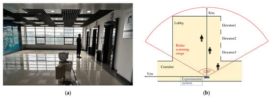 Experimental scenario: (a) the experimental system capturing pedestrian data, and (b) the plan view with the radar scanning range.