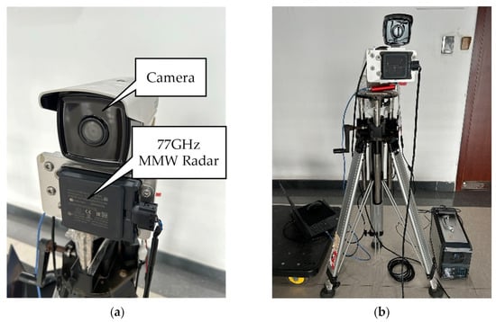 Experimental system: (a) the local details of 77GHz radar and camera, and (b) radar and camera are installed on a tripod.