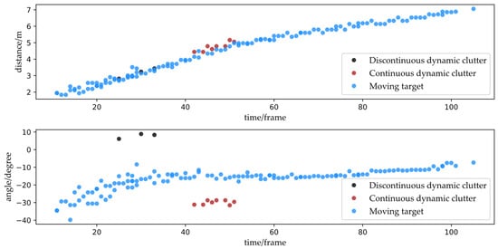 By examining the characteristics of the spatial distribution and spatial–temporal distribution of the point cloud data collected by the 2D MMW radar in a closed space, the uninterested points of the data were divided into three categories: static clutter, non-continuous dynamic clutter, and continuous dynamic clutter, as follows: