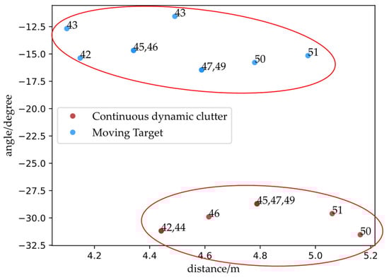 Spatial distribution of continuous dynamic clutter–target measurement pairs, where blue points represent measurement of targets and red points represent continuous dynamic clutter, and each sequence is marked by a red circle.