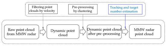 The processing flow of the experimental data is shown in Figure 11. The raw point cloud data captured by the 2D millimeter-wave radar were first restricted by the velocity information, which was removed from the static noise, and then the dynamic point cloud data were obtained. After being pre-processed by a clustering method, the dynamic point cloud data were used for tracking and target number estimation.