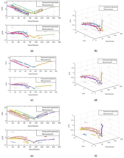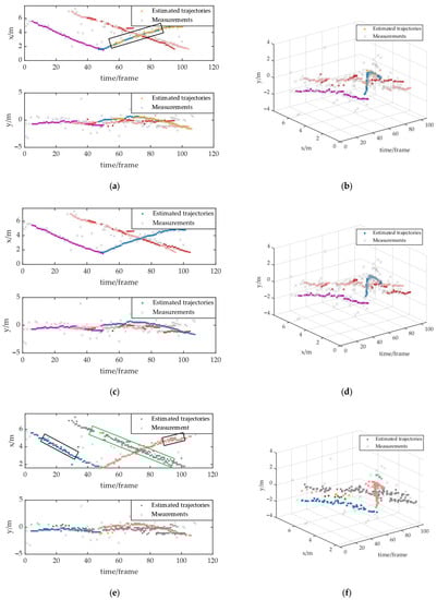 The false trajectories estimated by the LMB filter are marked by black boxes in Figure 12a, where HDBSCAN also estimated false-target trajectories in the region. The trajectories are marked by the black and red boxes in Figure 12e, where two of the approaching trajectories were also estimated by HDBSCAN as one target. This may be because the clutters in the middle of the two trajectories made the point clouds of the two trajectories reachable, and the two trajectories were mistakenly considered as the same target. The trajectories mentioned in Figure 12c were more accurately estimated by the HCM-LMB filter, although there were a few assignment errors.