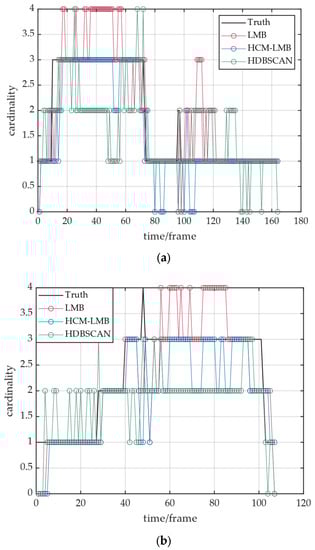 The cardinality estimation with time for the LMB filter, the HCM-LMB filter, and HDBSCAN in scenes A and B is shown in Figure 14a,b, respectively. The bias of the HCM-LMB filter for the target number estimation was more accurate compared to the LMB filter and HDBSCAN.