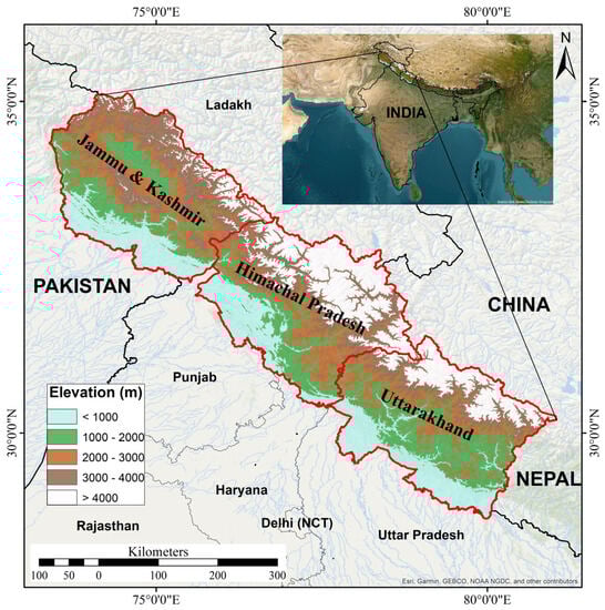 This study was conducted for the three Indian Himalayan states of Jammu and Kashmir (JK), Himachal Pradesh (HP), and Uttarakhand (UK), which collectively span 151,382 km2 of the Indian Western Himalayas (IWH) region and constitute 4.6% of the country’s total area. This study area (Figure 1) extends between 73°26′E and 81°01′E and between 28°44′N and 36°58′N. Using the Köppen climate classification, most of the IWH region has a subtropical highland climate (Cwb), and the average temperature ranges from 37 °C in summers to 2.2 °C in winters, with the warmest months being March to June (pre-monsoon). The monsoon season, which lasts from July to September, accounts for the majority of the annual rainfall, which ranges from 600 to 2000 mm. Altitude in this region ranges from 187 m to more than 7000 m. The Pir Panjal Range, Dhauladhar Range, Zanskar Range, and the Great Himalayas are just a few of the notable mountain ranges that make up the Western Himalayas. These mountain ranges are made up of high peaks, jagged summits, and deep valleys. This altitudinal variation results in the formation of a specific pattern of vegetation that includes subtropical woods, conifer mountain forests, alluvial grasslands, and alpine meadows. One of the world’s mega-biodiversity hotspots, this area is the habitat for half of India’s native plant species and one-tenth of the world’s higher-altitude plant and animal species; however, many of the species are yet to be thoroughly studied [45].
