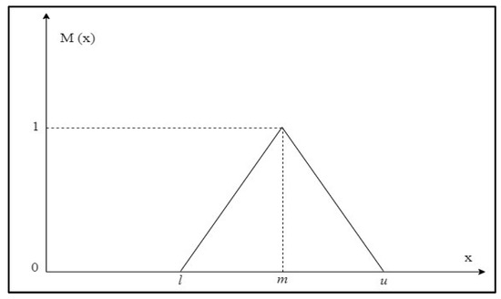 A collection of fuzzy numbers, denoted as Ã, within a subset X of the real number set R, is established as a set of ordered pairs à = {x, µÃ(x)}, where x belongs to X and µÃ(x): X → [0, 1]. The function µÃ(x) is recognized as the membership function for Ã, responsible for assigning a membership grade ranging between 0 and 1 to each element x, signifying its degree of association [74,78]. A normalized fuzzy set has a special case in which the total of the membership values of all its elements is equal to 1. In other words, the membership values are scaled or changed so that they total one [79]. Depending on membership function, there are many kinds of fuzzy numbers, but the triangular and trapezoidal shapes are the most common and useful. Trapezoid fuzzy numbers address more widespread cases of ambiguity in decision-making analysis ideas [80,81]. But triangular fuzzy numbers are preferred over trapezoidal fuzzy numbers due to their inherent simplicity and better interpretability in multi-criteria decision-making problems [82]. Furthermore, the usage of triangular fuzzy numbers frequently results in simpler mathematical computations and streamlined decision algorithms [83]. The triangular fuzzy number is depicted in Figure 3. The triangular fuzzy numbers (TFNs) used in this paper for the FFS zonation of the IWH were given by [72].